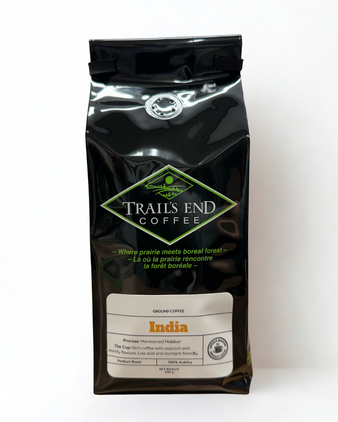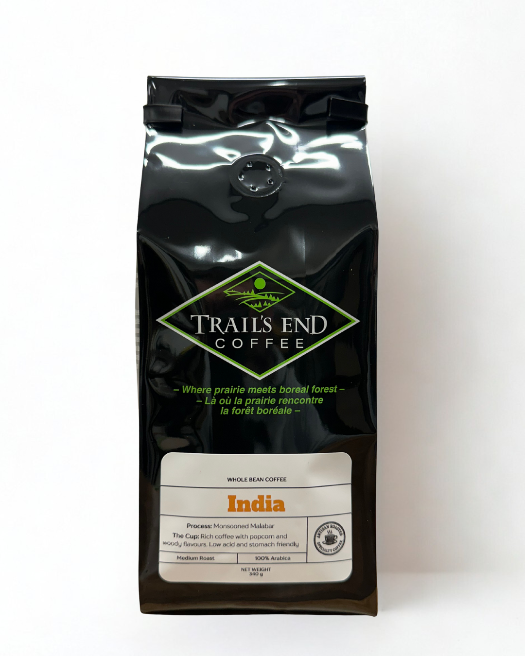 Low-acid. This Indian coffee from Malabar is very mild and easy on the stomach. It is a ‘Monsoon’ process. Beans are stored in bins over the monsoon season. The rain waters wash over the bins lowering the acidity of the coffee.